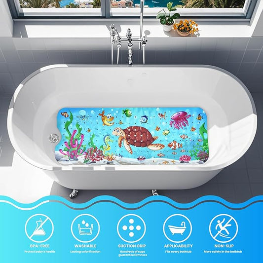 Linoows Baby Bath Tub Mat, 40 x 16 Inch Extra Large Non Slip Kids Cartoon Bathtub Shower Mats with Suction Cups & Drain Holes, Machine Washable for Bathroom, Undersea Sea Turtle