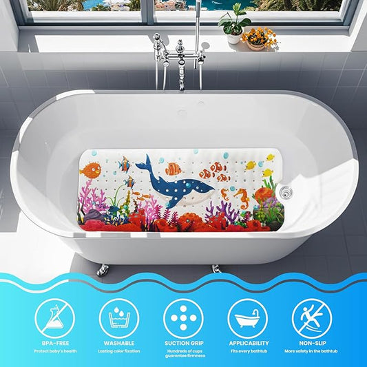 Linoows Baby Bath Tub Mat, 40 x 16 Inch Extra Large Non Slip Kids Cartoon Bathtub Shower Mats with Suction Cups & Drain Holes, Machine Washable for Bathroom, Undersea Blue Whale