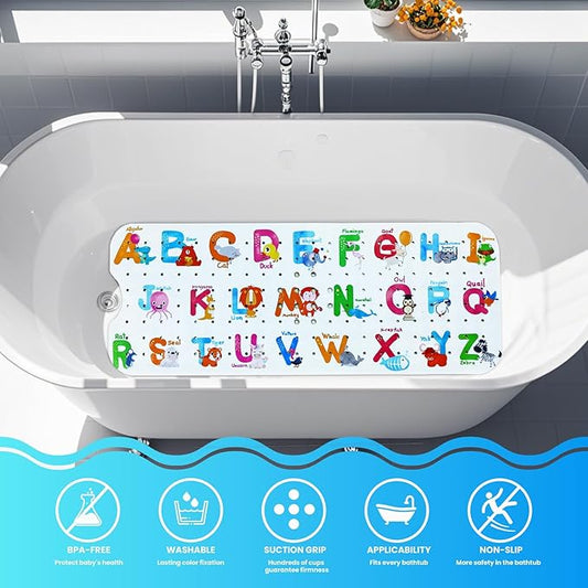 Linoows Baby Bath Tub Mat, Extra Large Non Slip Kids Cartoon Bathtub Shower Mats with Suction Cups & Drain Holes, Machine Washable for Bathroom, 40 x 16 Inch, Alphabet Animals Pattern