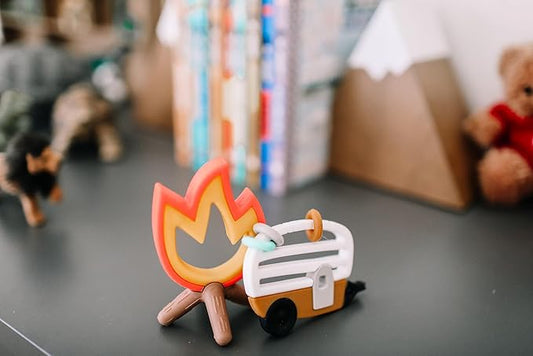 Lucy Darling Little Camper Baby Teether Set – 2 Textured Silicone Teething Toys (Camper & Campfire) for Babies 3–6 Months | BPA-Free, Easy to Hold & Clean | Baby Registry & Shower Gift