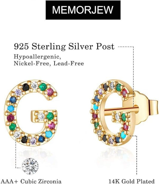 Memorjew Initial Stud Earrings for Women, Hypoallergenic 925 Sterling Silver Post Rainbow Cubic Zirconia Gold Plated 26 Initial Earrings for Women Jewelry Gifts
