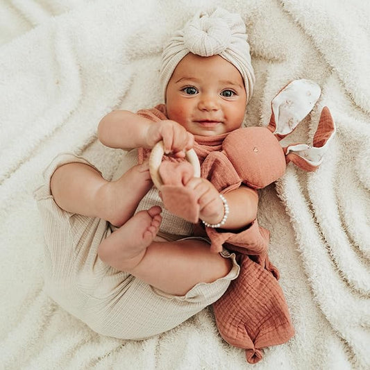 Mikito Organic Cotton Newborn Gifts Box, Unisex Loveys & Accessories incl. Muslin Baby Comforter + Baby Bandana Bib + Wooden Teether + Birth Announcement Sign