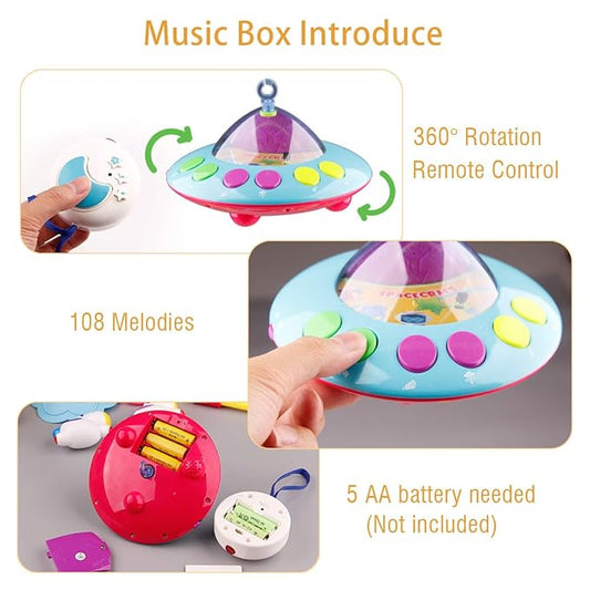 Mini Tudou Musical Baby Crib Mobile Toy with Lights and Music, Star Projector Function and Cartoon Rattles, Remote Control Musical Box with 108 Melodies, Toy for Newborn Sleep