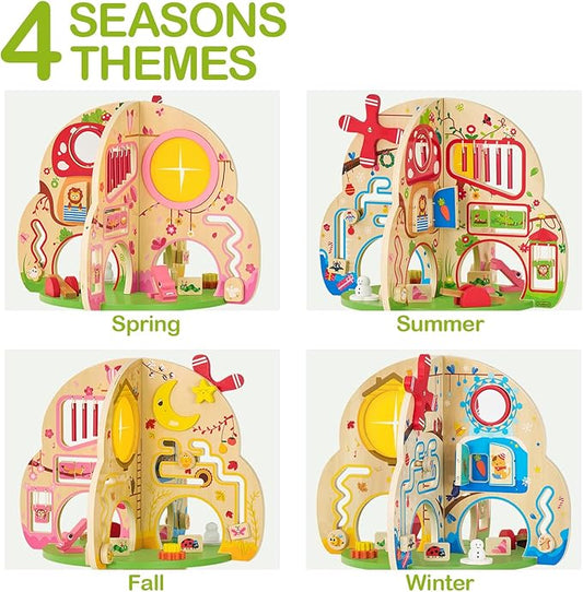 Monläurd® Montessori Wooden Tree Activity Center, Sensory Table & Busy Board for Toddlers 1-3, 4-Season Learning Activity Cube for Playroom & Daycare