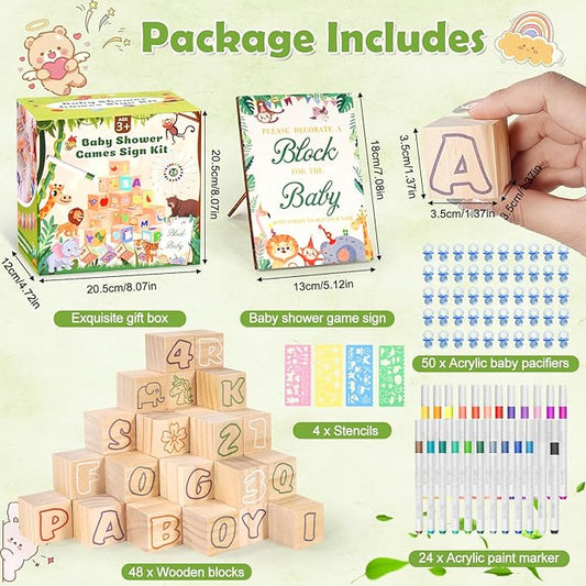 115 Pcs Baby Shower Games Sign Kit, Baby Shower Blocks to Decorate with 48 Wooden Blocks 50 Acrylic Baby Pacifiers 75 Stencils 24 Acrylic Paint Marker, Suitable for Gender Reveal Game
