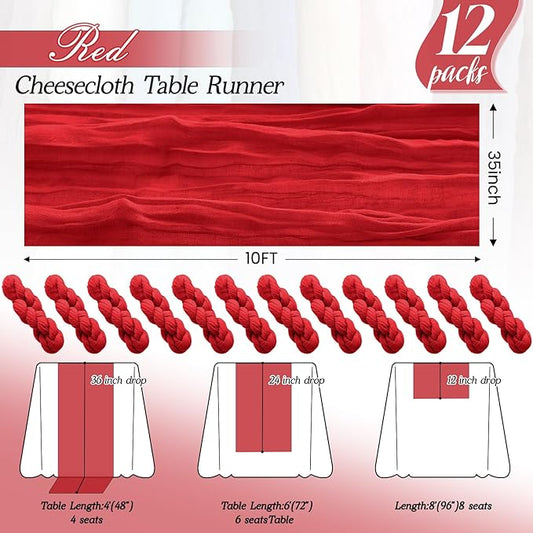 12Pack Red Table Runner 35 x 120 inch Cheesecloth Table Runner 10FT Boho Table Runners Rustic Gauze Cheese Cloth Table Runners for Party Wedding Birthday Dining Bridal Shower Baby Shower Decor