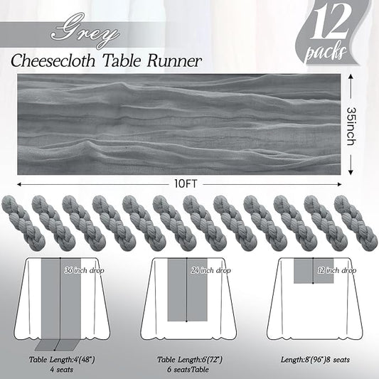 12Pack Grey Table Runner 35 x 120 inch Cheesecloth Table Runner 10FT Boho Table Runners Rustic Gauze Cheese Cloth Table Runners for Party Wedding Birthday Dining Bridal Shower Baby Shower Decor