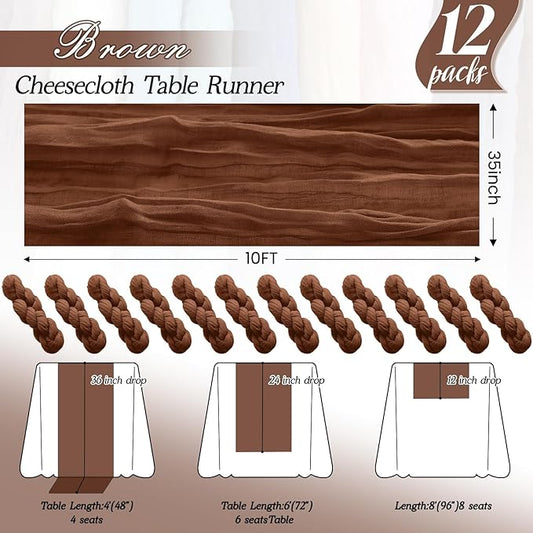 12Pack Brown Table Runner 35 x 120 inch Cheesecloth Table Runner 10FT Boho Table Runners Rustic Gauze Cheese Cloth Table Runners for Party Wedding Birthday Dining Bridal Shower Baby Shower Decor
