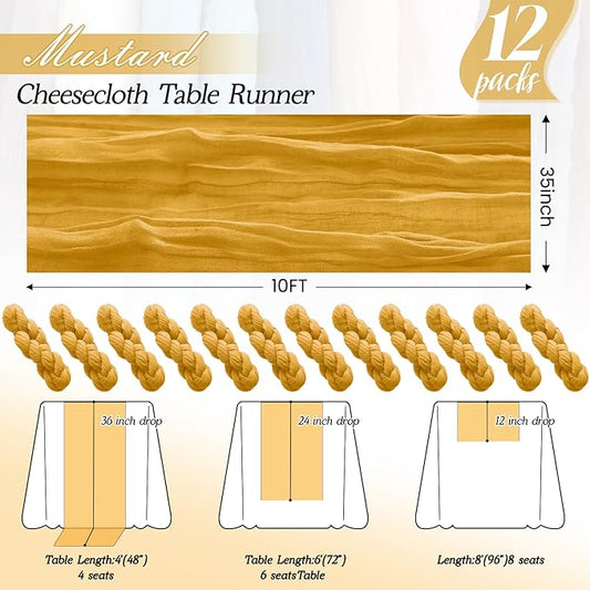 12Pack Gold Table Runner 35 x 120 inch Cheesecloth Table Runner 10FT Boho Fall Table Runners Rustic Gauze Cheese Cloth Table Runners for Party Wedding Birthday Dining Bridal Shower Baby Shower Decor