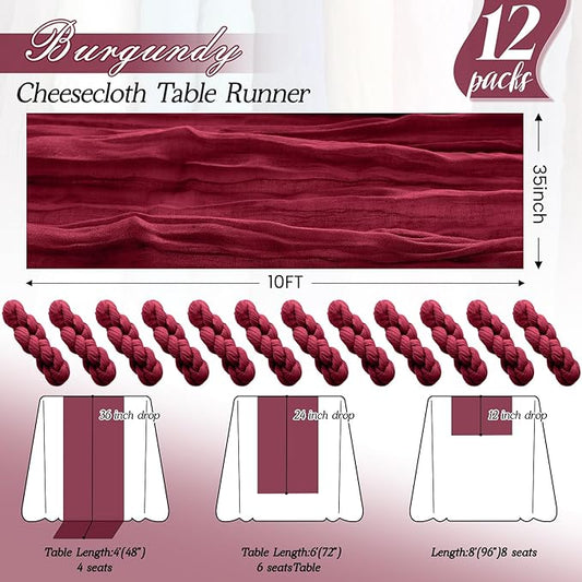 12Pack Burgundy Table Runners 10FT Cheesecloth Table Runner 35x120inch Cheese Cloth Table Runner Rustic Boho Gauze Table Runners for Party Wedding Birthday Dining Bridal Baby Shower Decor