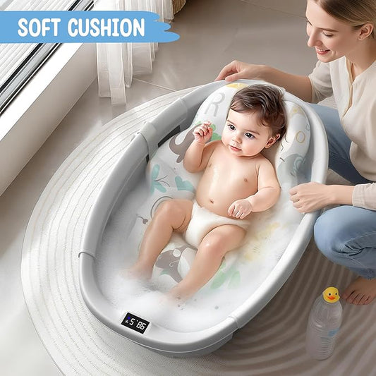 Collapsible Baby Bathtub - Large Baby Bath Tub with Thermometer & Cushion | Travel Portable Newborn Infant Bathtub | Foldable Toddler Bathtub for Baby 0 to 36 Months (Grey)