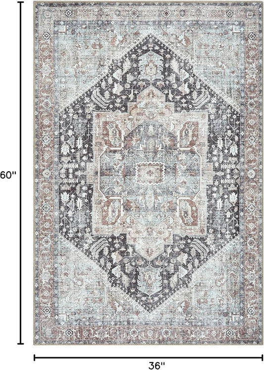 Bloom Rugs Washable Non-Slip 3' x 5' Rug - Charcoal/Brown Traditional Medallion Area Rug for Living Room, Bedroom, Dining Room, and Kitchen - Exact Size: 3' x 5'