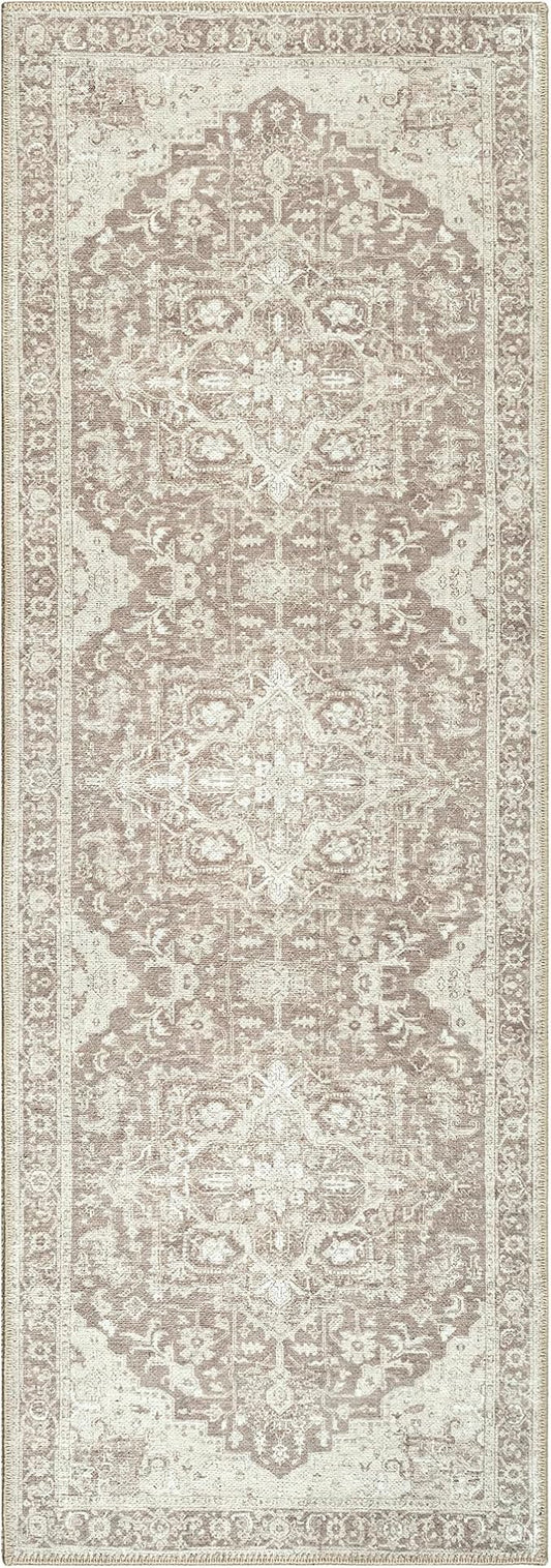 Bloom Rugs Washable Non-Slip 12 ft Runner - Light Brown Traditional Medallion Runner for Entryway, Hallway, Bathroom, and Kitchen - Exact Size: 2.5' x 12'