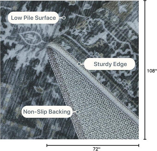 GENIMO 6x9 Area Rugs for Living Room, Machine Washable Non Slip Vintage Rugs, Low Pile Lightweight Chenille Print Rug for Bedroom, Dining Room, Home Office,Dark Gray