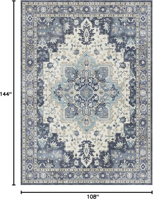 GENIMO 9x12 Area Rugs for Living Room, Machine Washable Non Slip Vintage Rugs, Low Pile Lightweight Chenille Print Rug for Bedroom, Dining Room, Home Office, Center Blue