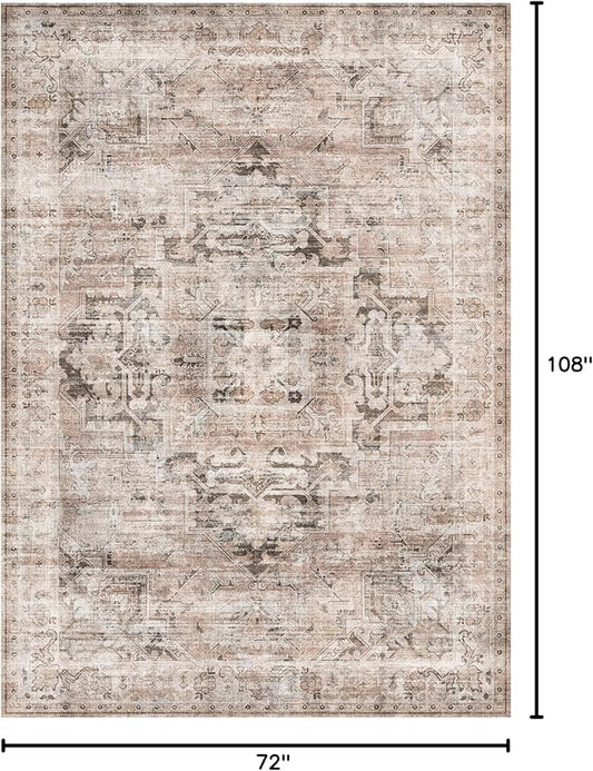 GENIMO 6x9 Area Rugs for Living Room, Machine Washable Non Slip Vintage Retro Rugs, Low Pile Lightweight Thin Print Rug for Bedroom, Dining Room, Home Office, Brownishi Drab