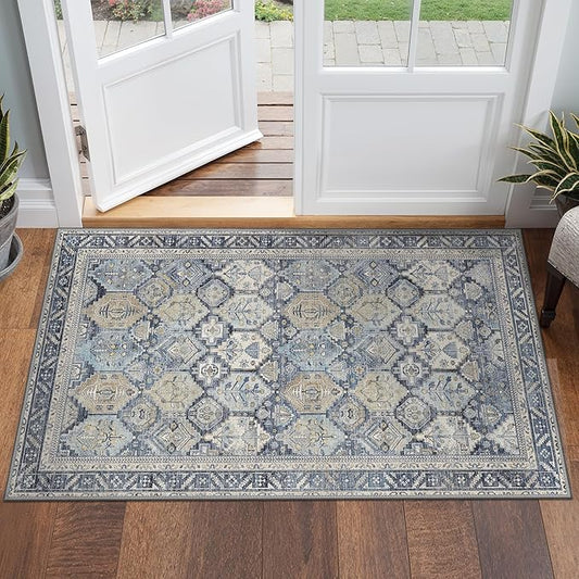 GENIMO 2x3 Area Rugs for Living Room, Machine Washable Non Slip Vintage Rugs, Low Pile Lightweight Chenille Print Rug for Bedroom, Dining Room, Home Office, Brown Blue