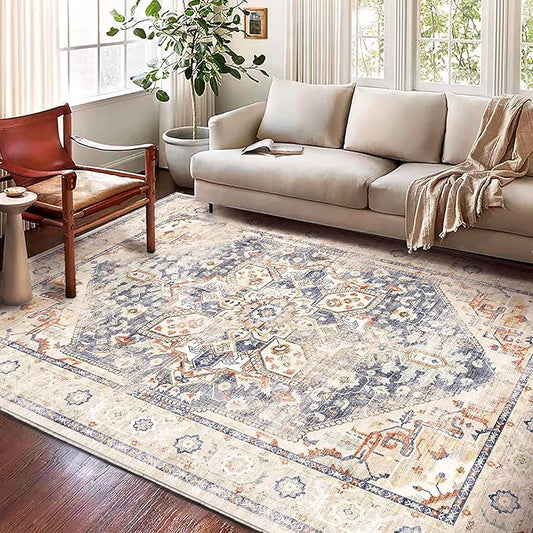 Washable Vintage Area Rug 6'x9' Boho Beige Blue Chic Medallion Distressed Design Non-Shedding Easy Care Ideal for High Traffic Areas in Living Room Bedroom Kitchen Office Large Carpet