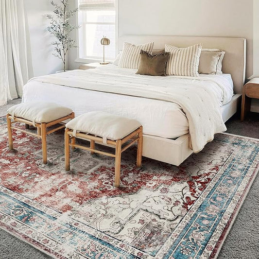 Area Rug 5'x7' Light Cyan and Light red Washable Rug Vintage Traditional Floor Cover Thin Retro Kitchen Indoor Distressed Non Slip Carpet for Living Room Bedroom Dining Room