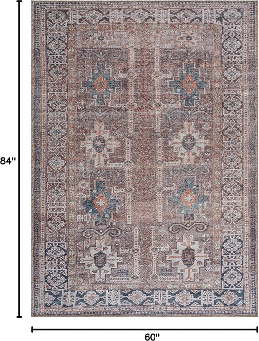 Bloom Rugs Washable 5' x 7' Rug - Brown/Blue/Orange Traditional Area Rug for Living Room, Bedroom, Dining Room, and Kitchen - Exact Size: 5' x 7'