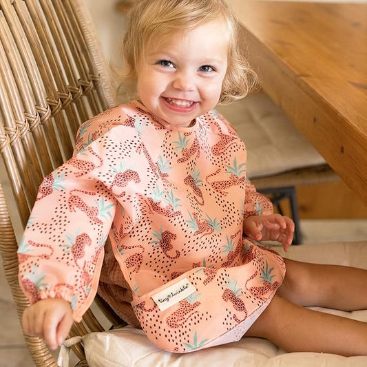 Tiny Twinkle Mess Proof Baby Bib,Waterproof Smock Baby Bib for Eating,Machine Washable Long Sleeve Bib,Baby Led Weaning,Toddler Bib (Leopard, Small 6-24 Months)