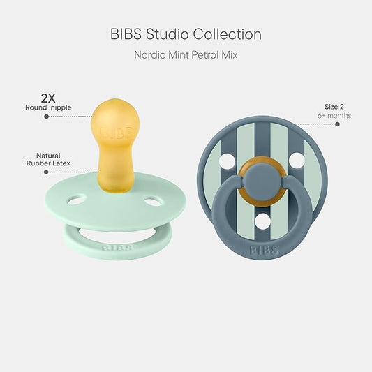 BIBS Pacifiers - Colour Studio 2 Pack | Round Nipple Baby Pacifier | BPA Free Natural Rubber Latex Soother | Made in Denmark | Size 6+ Months | Block Nordic Mint Petrol