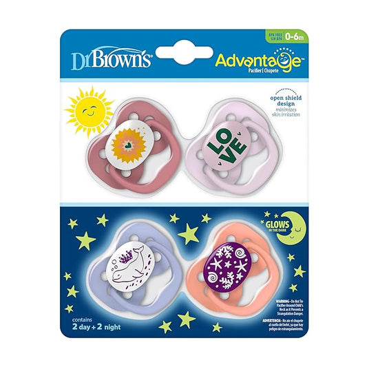 Dr. Brown's Advantage Glow-in-the-Dark Baby Pacifier, Fully Symmetrical Soother with Soft Silicone Bulb, Lavender Love-Coral Ocean, 0-6m, BPA Free, 4 Pack