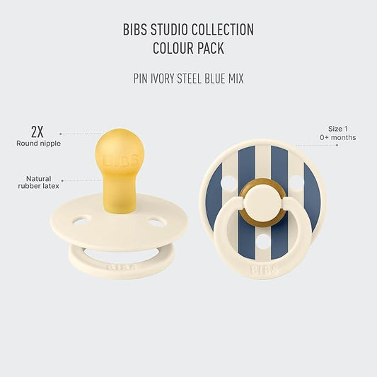 BIBS Pacifiers - Colour Studio 2 Pack | Round Nipple Baby Pacifier | BPA Free Natural Rubber Latex Soother | Made in Denmark | Size 0+ Months | Pin Ivory Steel Blue