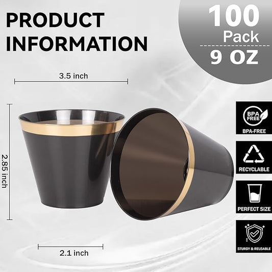 supernal 100 Pcs 9 oz Gold and Black Plastic Cups,Gold Rimmed Disposable Cups,Disposable Party Cup party,Plastic Cocktail Cups for Weddings, Birthdays & Festive Celebrations