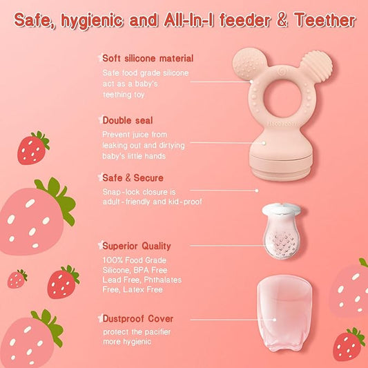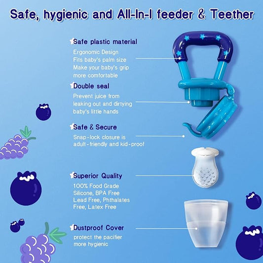 Baby Fruit Feeder with with 2 Extra Teats, Toddler Eating Essentials, BPAFree Feeding Supplies, Silicone Fresh Food Feeder for Safe Infant Self Feeding (Bear- Blue Pink)