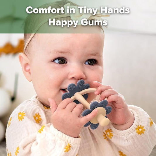 haakaa Silicone Twin Flower Teether,Nipple-Shaped End for Gum Massage,360° Baby Toothbrush Head for Self-Brushing Training,Easy to Grip-Steel Blue