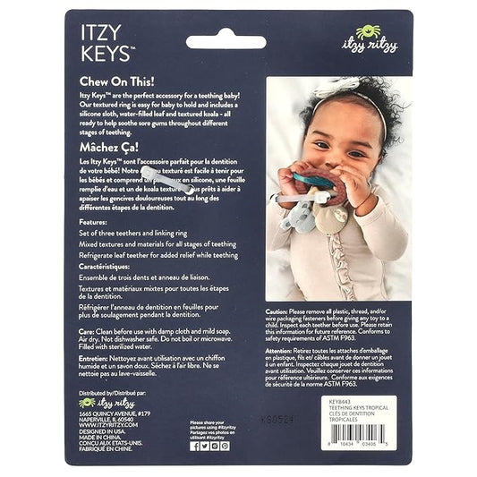 Itzy Ritzy Teething Keys Baby Teether Toy - Features a Braided Texture Ring & Keys, Includes a Water-Filled Leaf-Shaped Teether & Silicone Sloth & Koala Teething Toys, Ideal for Ages 3 Months & Up