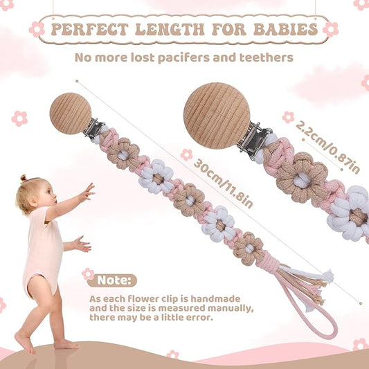 Pacifier Clip for Boys Girls Floral Daisy Macrame Baby Paci Clip Pacifier Holder Leash Boho Wooden Clips Handmade Braided Cotton Binky Clips (1pack:Caramel Style B)