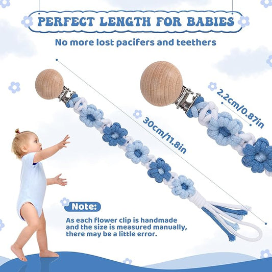 Pacifier Clip for Boys Girls Floral Daisy Macrame Baby Paci Clip Pacifier Holder Leash Boho Wooden Clips Handmade Braided Cotton Binky Clips (2pack:Blue Daisy × 2)