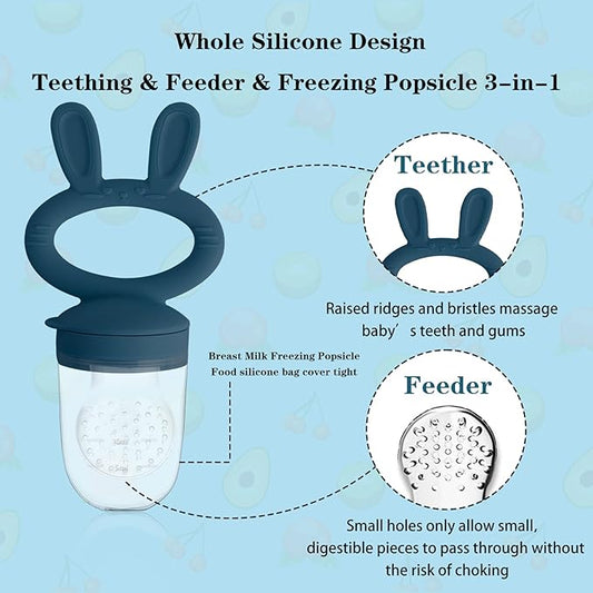 Baby Solids/Frozen Fruit Feeder Pacifier, Infant Teether Toy 4M+, BPA-Free Silicone Pouch & Nipple, Safely Introduce Solids, Teething Relief, 2-Pack - Blue/Green (Rabbit)