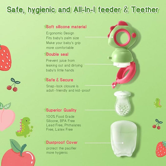Baby Fruit Food Feeder - Silicone Nibble Tray Combo - Breastmilk Popsicle Mold for Cooling Relief, BPA Free Mesh Feeder for Infant Self Feeding (Dinosaur Green + Pineapple)