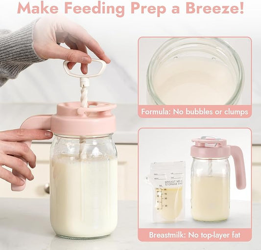 Papablic Glass Breastmilk Pitcher, Formula Mixing Pitcher with Mixing Handle Lid, Wide Mouth Mason Jar Mixer with Flip Locking Spout, Easy to Clean, BPA Free, Pink