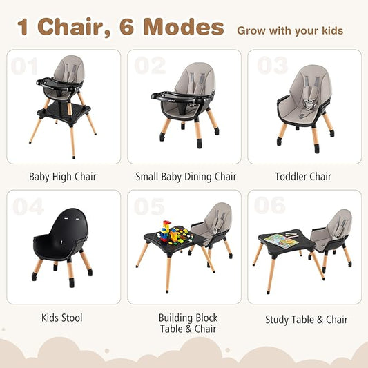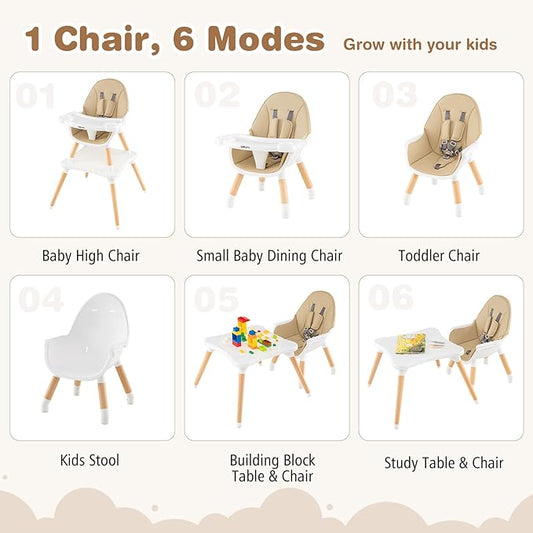 BABY JOY 6 in 1 High Chair, Convertible High Chairs for Babies and Toddlers/Booster Seat/Table and Chair Set, Infant Wooden Highchair w/ 5-Point Harness, 4-Position Removable Tray & PU Cushion (Khaki)