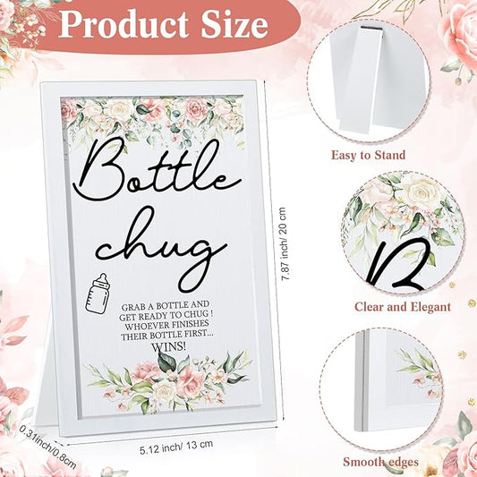 TrelaCo Floral Cool Baby Shower Games Bottle Chug Sign Wooden Floral Gift Sets Gender Reveal Party Favors and 12 Pcs Baby Bottle Shower Favor for Games Gender Reveal