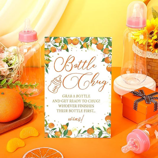 TrelaCo Little Cutie Cool Baby Shower Games Bottle Chug Sign Wooden Orange Theme Gift Sets Gender Reveal Party Favors and 12 Pcs Baby Bottle Shower Favor for Games Gender Reveal