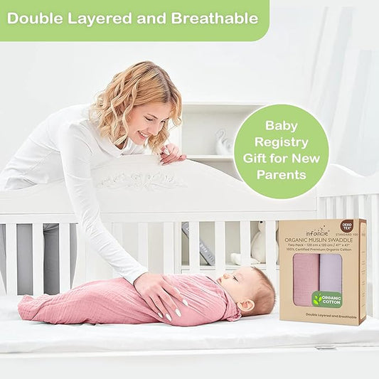 Organic Cotton Muslin Baby Blanket - 47x47 Inch Breathable Swaddle, Hypoallergenic Double-Layer, Versatile Use (Light Pink/Light Purple, 47x47 Inch)