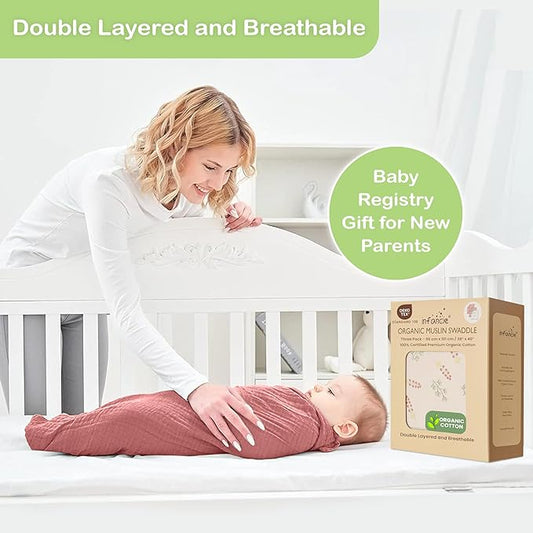 Organic Cotton Muslin Baby Blanket 3 Pack - 38x40 Inch Breathable Swaddle, Hypoallergenic Double-Layer, Versatile Use (Pink, Floral, Rust, 38x40 Inch)