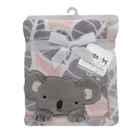 Lambs & Ivy Calypso Pink/Gray Koala Leaf Print Luxury Coral Fleece Baby Blanket