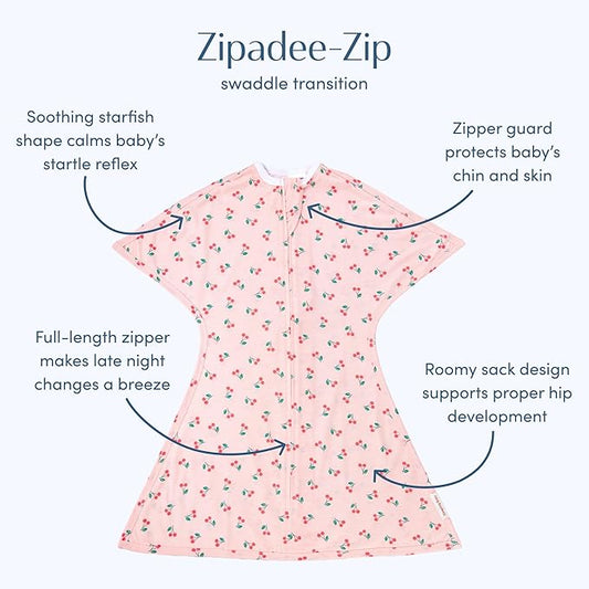 SleepingBaby Zipadee-Zip Transition Swaddle - Cozy Baby Swaddle Blanket with Zipper Convenience - Roomy Wearable Blanket for Easy Diaper Changes - Cherries, Large (12-24 Month)