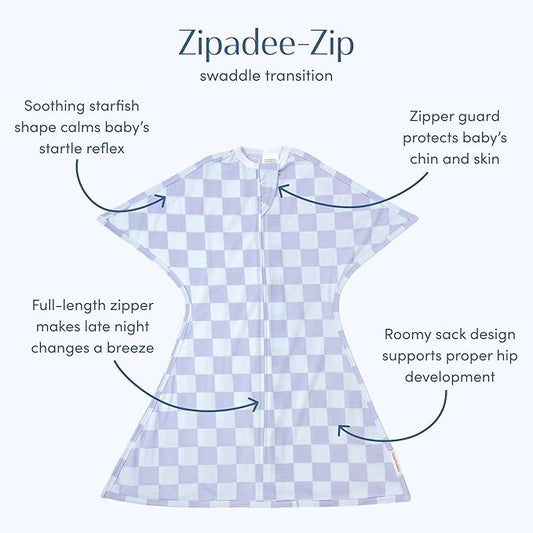 SleepingBaby Zipadee-Zip Transition Swaddle - Cozy Baby Swaddle Blanket with Zipper Convenience - Roomy Wearable Blanket for Easy Diaper Changes - Lavender Check, Small (4-8 Month)