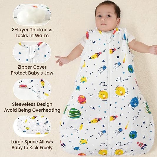 PHF 100% Cotton Baby Sleep Sack 12-18 Months, 2.5 TOG Winter Baby Wearable Blanket with 2-Way Zipper, Warm Comfy Quilted Sleeping Bags, Infant Sleeping Sack for Newborn Boys, Large Size, Space