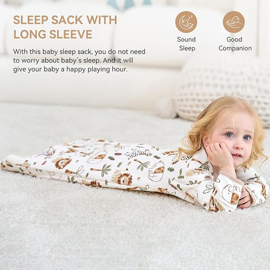 Baby Sleep Sack 18-24 Months, Long Sleeve Baby Wearable Blanket 0.5 Tog with Mittens, 2-Way Zipper Toddler Cotton Sleeping Sack for Boy and Girl Khaki Animal 2 Pack(XLarge)