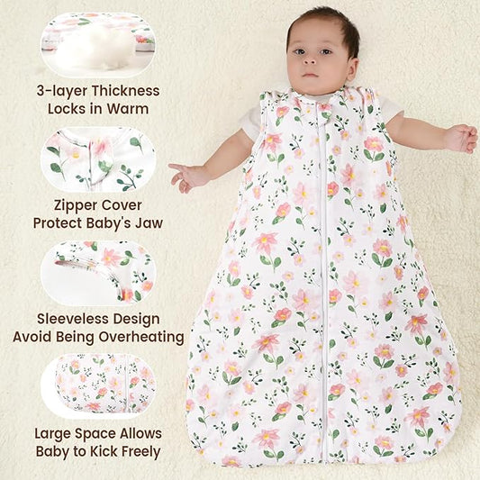 PHF 100% Cotton Baby Sleep Sack 12-18 Months, 2.5 TOG Winter Baby Wearable Blanket with 2-Way Zipper, Warm Comfy Quilted Sleeping Bags, Infant Sleeping Sack for Newborn Girls, Large Size, Floral