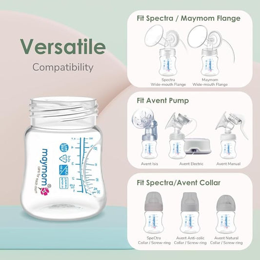 Maymom Wide-Mouth Milk Storage Collection Feeding Bottle with Nipple, Dome Cap, Bottle Top, SureSeal Disk; Compatible with Spectra/Luna Pumps; 4.7oz/140mL, 2pc & 9oz/280mL, 2pc
