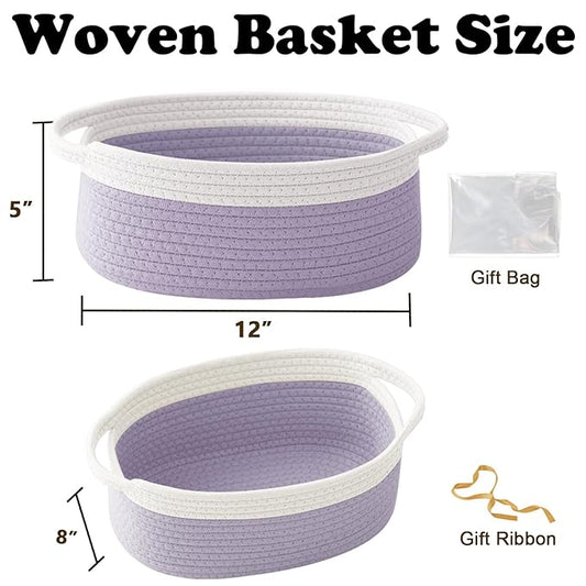 Gift Basket with Gift Bag and Ribbons,Small Rope Woven Shelf Storage,Baskets for Gifts Empty,Birthday,Shower,Decorative Organizer Box for Cat Dog Pet with Handles(White&Purple)